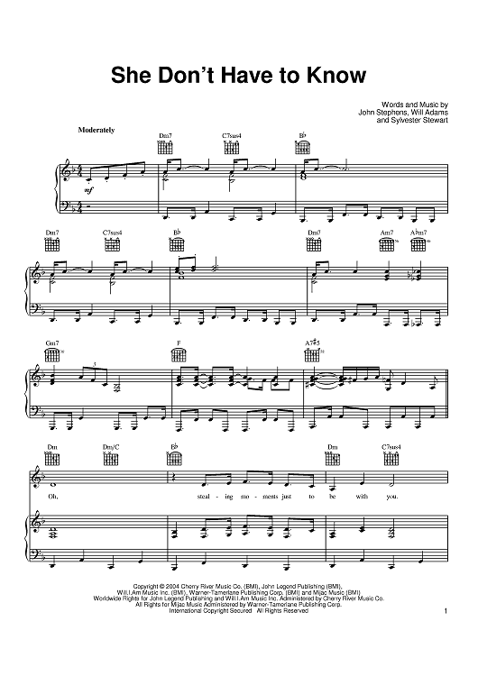 Digital Sheet Music for She Don't Have To Know by Sly Stone, John Legend, will.i.am scored for Piano/Vocal/Chords; id:384085