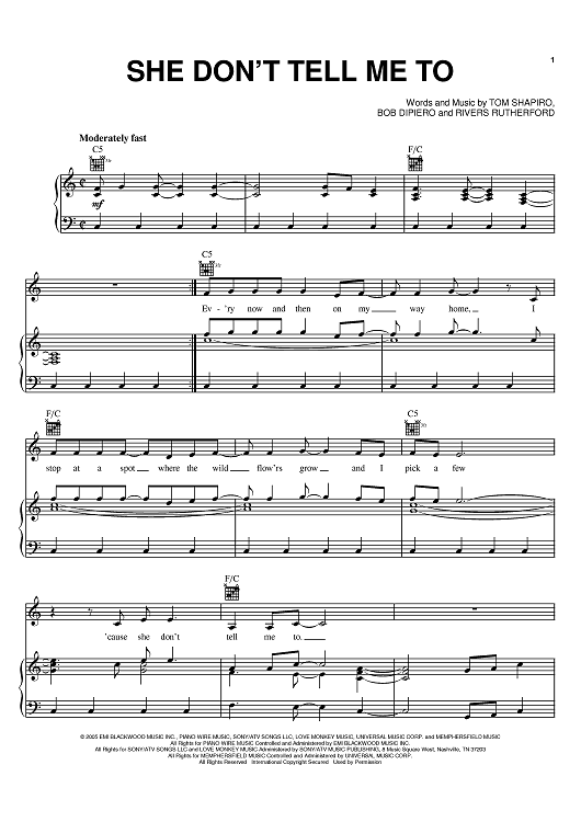 Digital Sheet Music for She Don't Tell Me To by Bob DiPiero, Rivers Rutherford, Tom Shapiro, Montgomery Gentry scored for Piano/Vocal/Chords; id:388032
