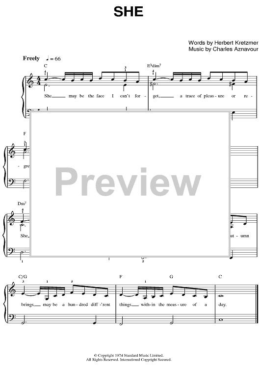 "She" sheet music. Theme from the BBC series 'Seven Faces of Woman' was originally witten in French and titlesd "Tous les visages de l'amour" wth different lyrics.