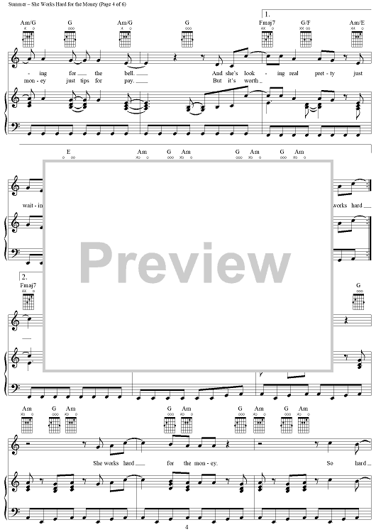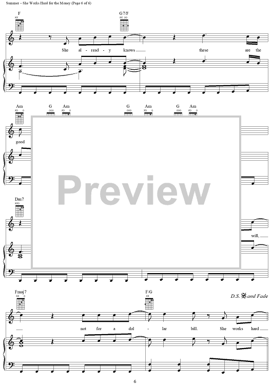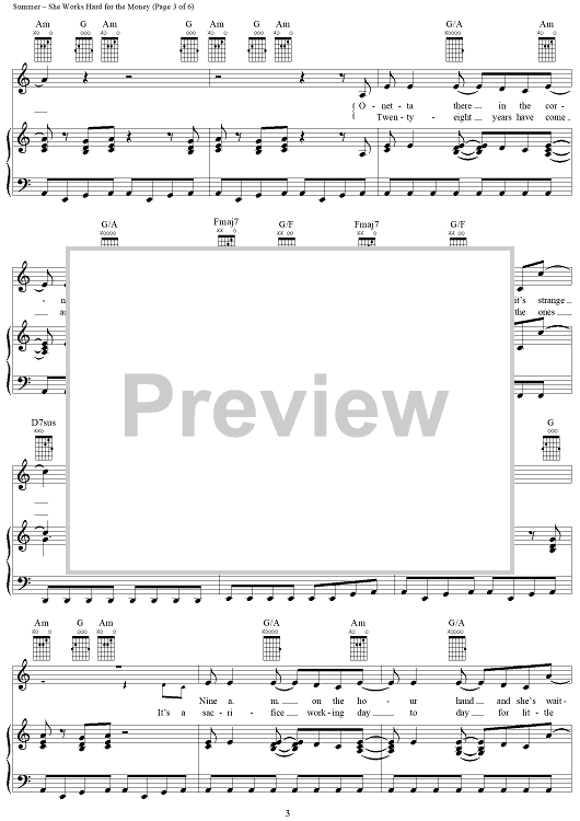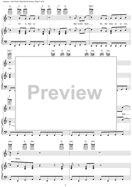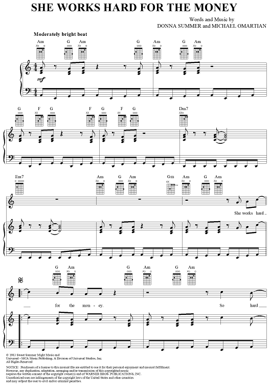 Digital Sheet Music for She Works Hard for the Money by Michael Omartian, Donna Summer scored for Piano/Vocal/Chords; id:297070