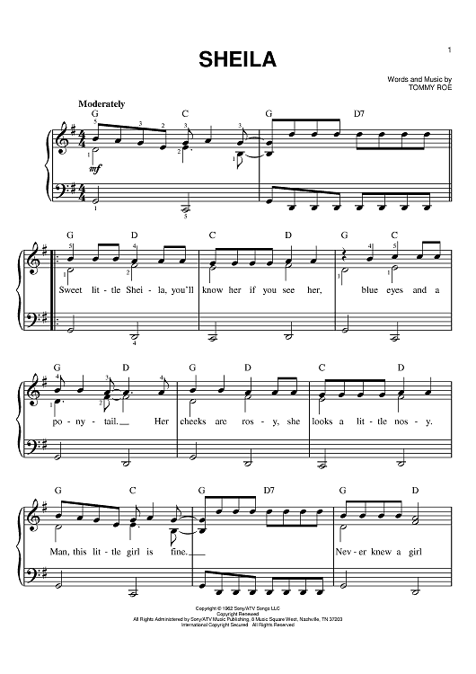 Digital Sheet Music for Sheila by Tommy Roe scored for Easy Piano; id:369207
