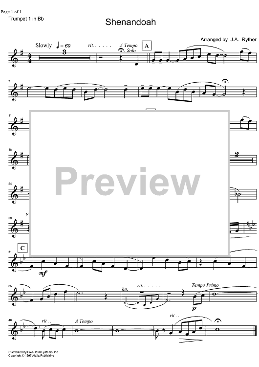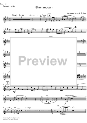 Digital Sheet Music for Shenandoah - B-flat Trumpet 1 by , John A. Ryther, Traditional scored for Brass Quintet; id:332238