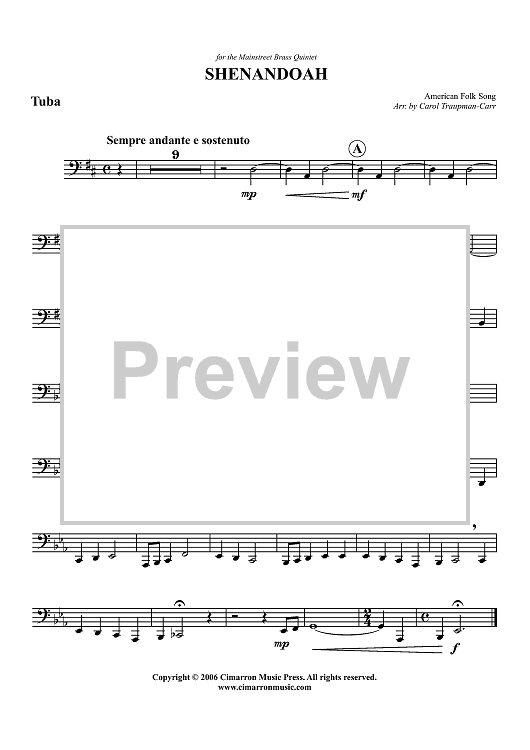 Digital Sheet Music for Shenandoah - Tuba by , American Folk Song, Carol Traupman-Carr scored for Brass Quintet; id:357459