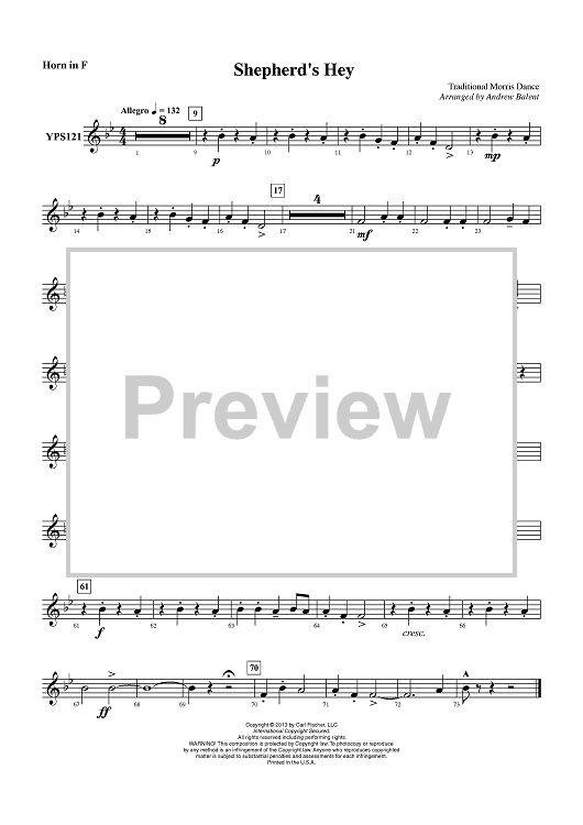 Digital Sheet Music for Shepherd’s Hey - Horn in F by Traditional, Andrew Balent scored for Concert Band; id:436300