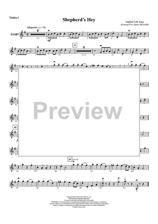 Digital Sheet Music for Shepherd's Hey - Violin 1 by Traditional, James Meredith scored for String Orchestra; id:449898