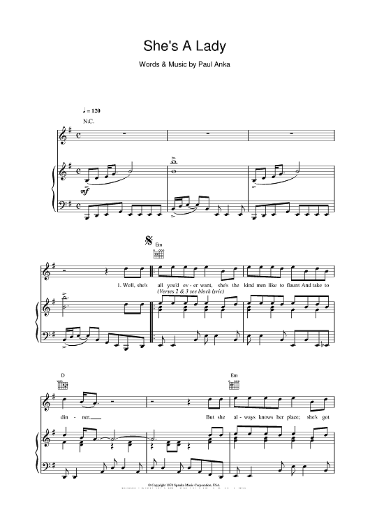Digital Sheet Music for She's A Lady by Tom Jones, Paul Anka scored for Piano/Vocal/Chords; id:379635