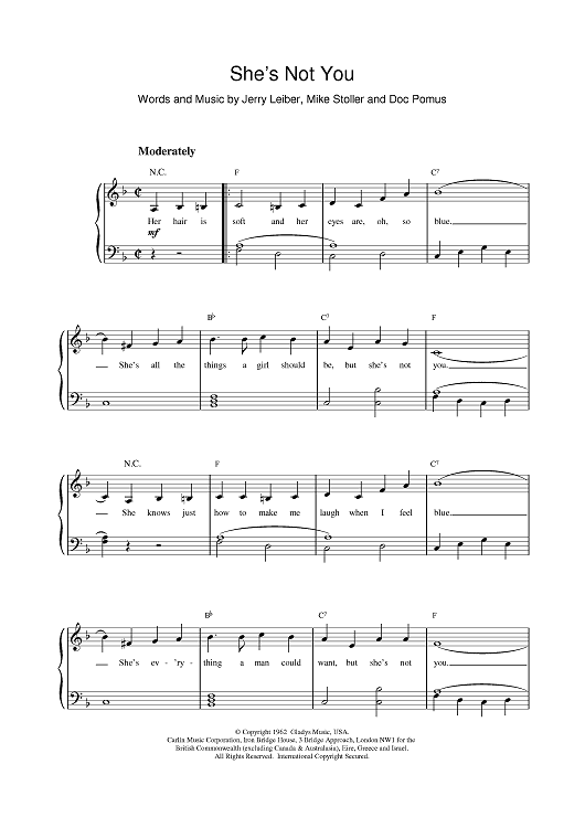 Digital Sheet Music for She's Not You by Elvis Presley, Jerry Leiber, Mike Stoller, Doc Pomus scored for Easy Piano; id:379985