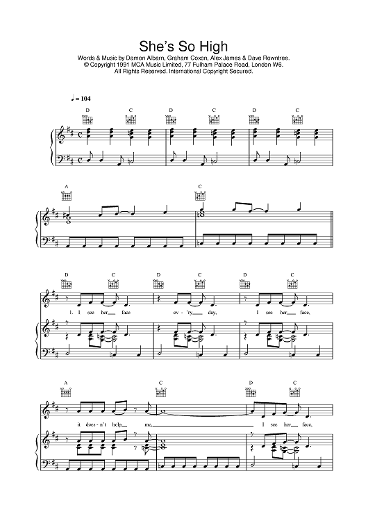 Digital Sheet Music for She's So High by Blur scored for Piano/Vocal/Chords; id:376193
