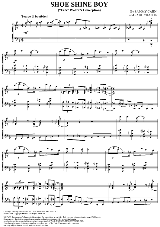 Digital Sheet Music for Shoe Shine Boy (''Fats'' Waller's Conception) by Sammy Cahn, Fats Waller, Saul Chaplin scored for Piano Solo; id:316974