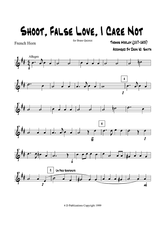 Digital Sheet Music for Shoot, False Love, I Care Not - French Horn by , Thomas Morley, Dean W. Smith scored for Brass Quintet; id:320249