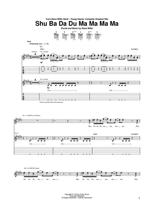 Digital Sheet Music for Shu Ba Da Du Ma Ma Ma Ma by Steve Miller, Steve Miller Band scored for Guitar Tab; id:386187