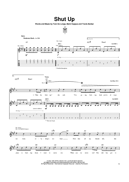 Digital Sheet Music for Shut Up by Travis Barker, Mark Hoppus, blink-182, Tom DeLonge scored for Guitar Tab; id:370610