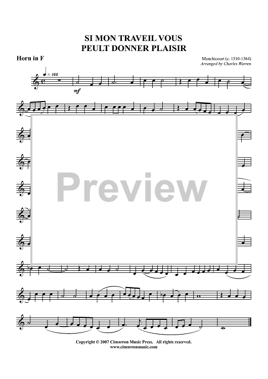 Digital Sheet Music for Si mon Traveil vous peult donner plaisir - Horn in F by , Charles Warren, Manchicourt scored for Brass Quintet; id:365712