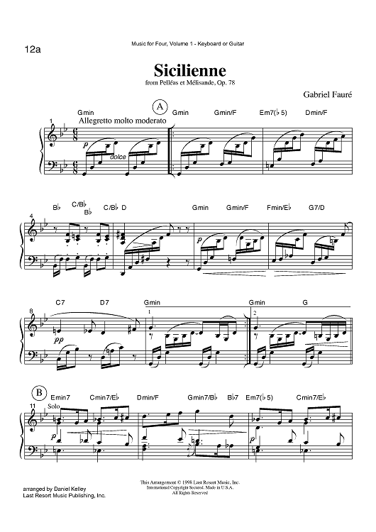 Digital Sheet Music for Sicilienne - from Pelléas et Mélisande, Op. 78 - Keyboard or Guitar by , Gabriel Fauré, Daniel Kelley scored for Instrumental Quartet; id:423575