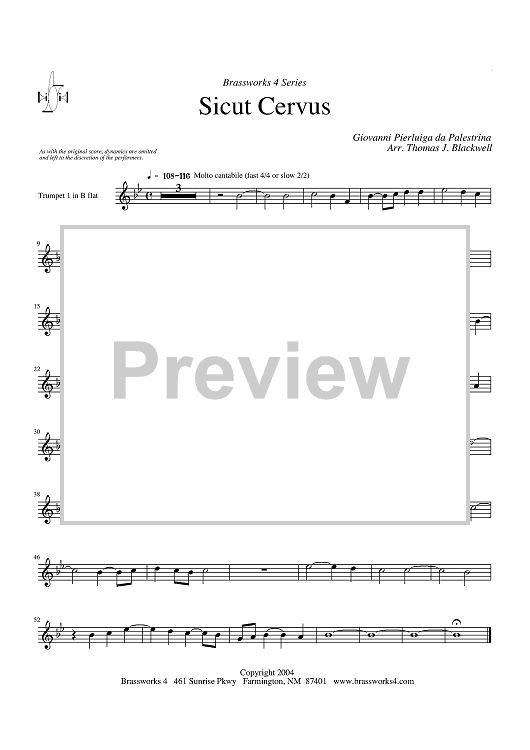 Digital Sheet Music for Sicut Cervus - Trumpet 1 by Giovanni Pierluigi da Palestrina, Thomas J. Blackwell scored for Brass Quartet; id:318783