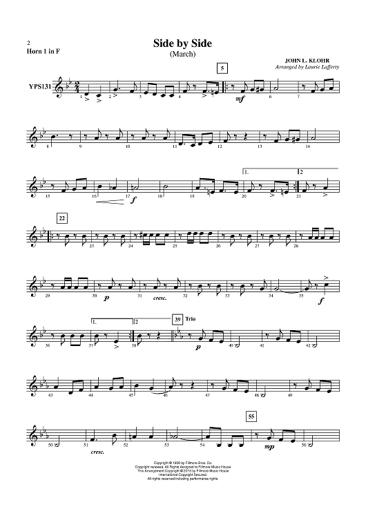 Digital Sheet Music for Side by Side (March) - Horn 1 in F by John N. Klohr, Laurie Lafferty scored for Concert Band; id:436522