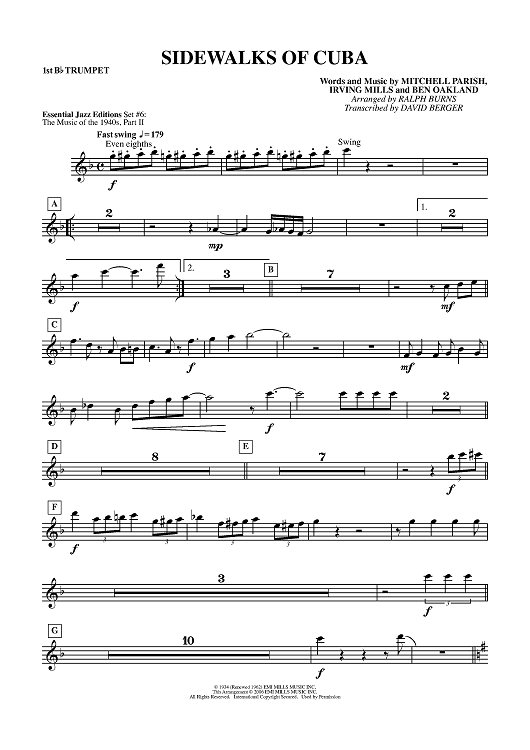 Digital Sheet Music for Sidewalks of Cuba - B-flat Trumpet 1 by Mitchell Parish, Irving Mills, Ben Oakland, Ralph Burns scored for Jazz Ensemble; id:360425