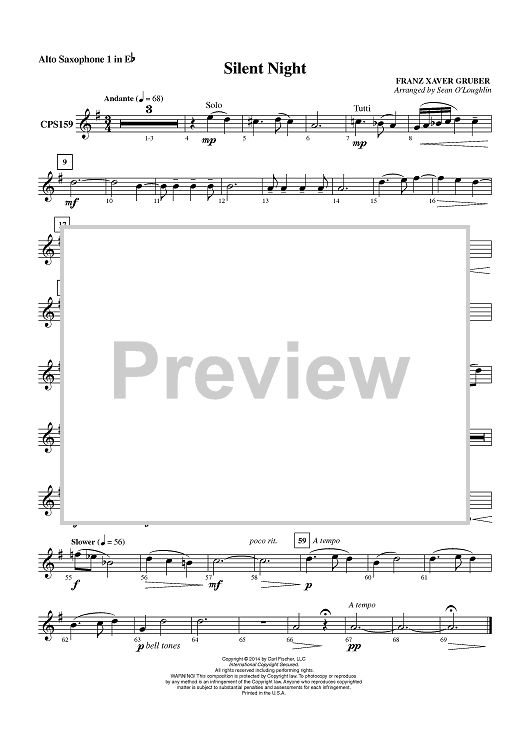 Digital Sheet Music for Silent Night - Alto Saxophone 1 by Franz Xaver Gruber, Sean O'Loughlin scored for Concert Band; id:451150