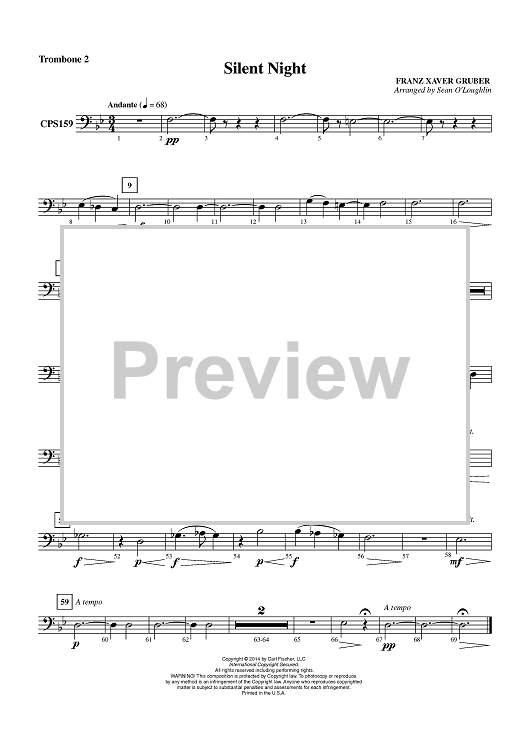Digital Sheet Music for Silent Night - Trombone 2 by Franz Xaver Gruber, Sean O'Loughlin scored for Concert Band; id:451160