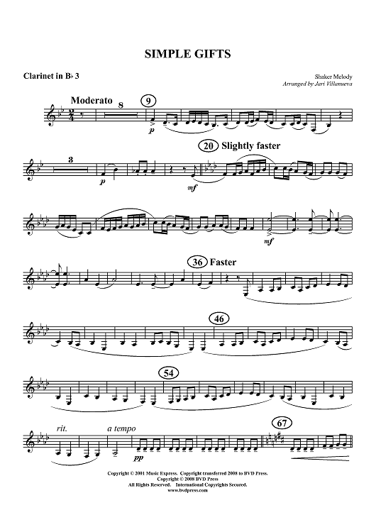 Digital Sheet Music for Simple Gifts - Clarinet 3 in B-flat (op. Alto Cl.) by Traditional, Jari Villanueva scored for Clarinet Quartet; id:404878