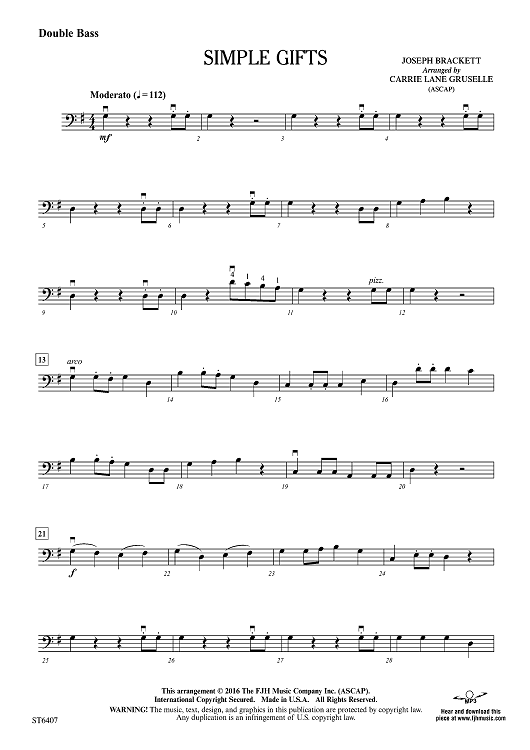 Digital Sheet Music for Simple Gifts - Double Bass by Carrie Lane Gruselle, Joseph Bracket, Jr. scored for String Orchestra; id:500922