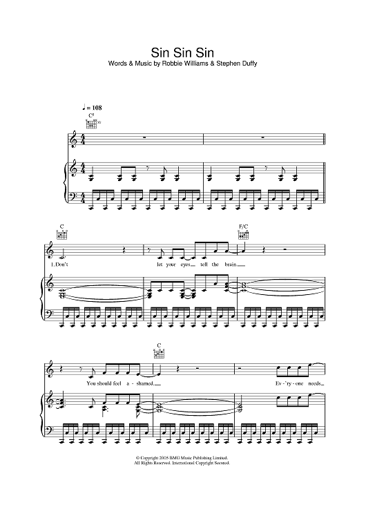 Digital Sheet Music for Sin Sin Sin by Robbie Williams, Stephen Duffy scored for Piano/Vocal/Chords; id:387495