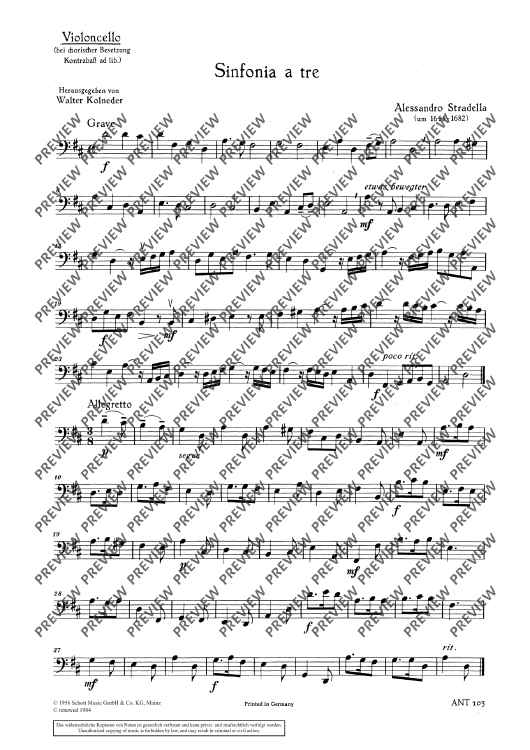 Digital Sheet Music for Sinfonia a tre - Cello/double Bass by Alessandro Stradella scored for 2 Violins (oboes) And Basso Continuo (piano, Harpsichord); Cello/double Bass Ad Libitum; id:491440