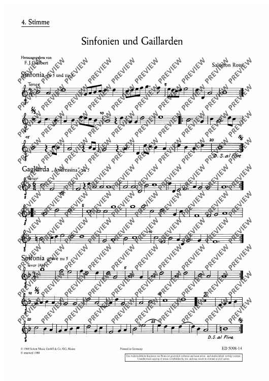 "Sinfonien und Gaillarden - Tenor Recorder" Sheet Music by Salomone de Rossi