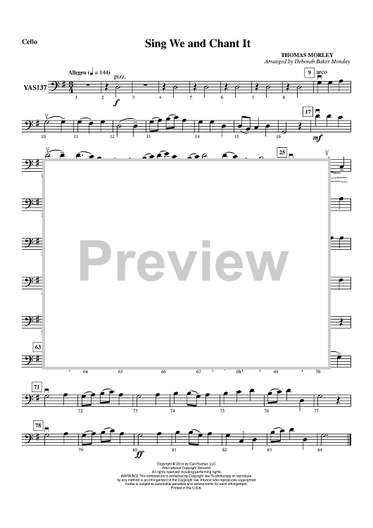 Digital Sheet Music for Sing We and Chant It - Cello by Thomas Morley, Deborah Baker Monday scored for String Orchestra; id:450006