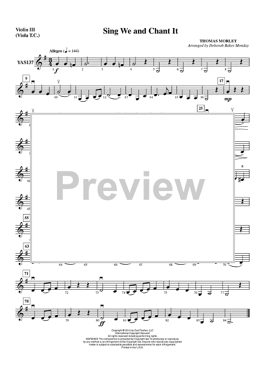 Digital Sheet Music for Sing We and Chant It - Violin 3 (Viola T.C.) by Thomas Morley, Deborah Baker Monday scored for String Orchestra; id:450004