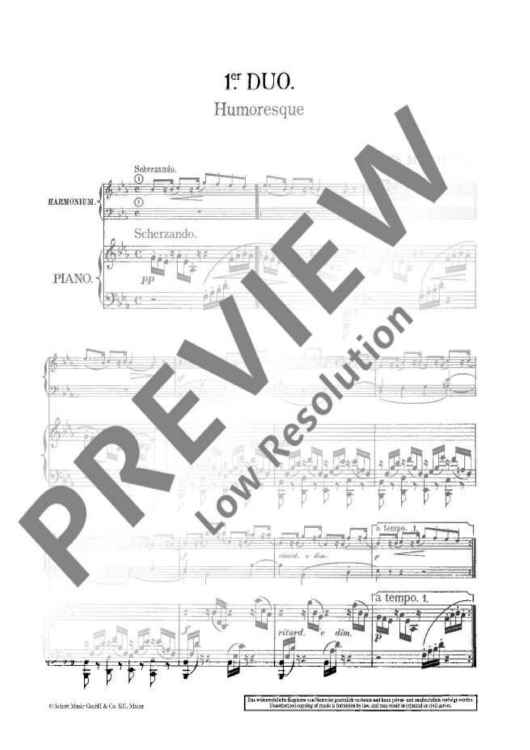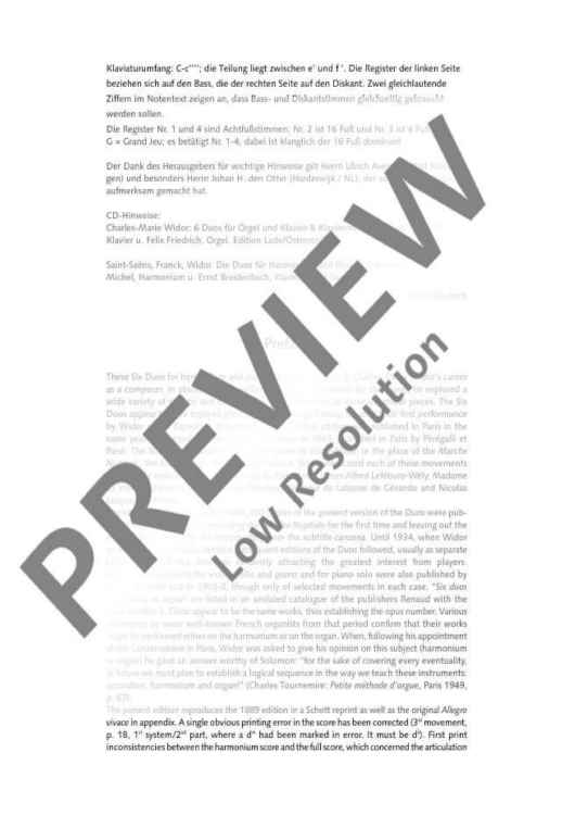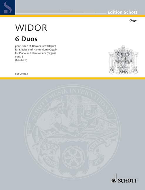 The six Duos for Harmonium and Piano were composed around 1867 in Charles-Marie Widor's first creative period. Twenty years later, in October 1889, they were published by Schott in six separate editions. This reprint is the first publication which contains all pieces, thus supporting the performance of these magnificent pieces for the rare combination of harmonium and piano.