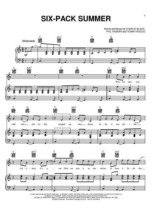 Digital Sheet Music for Six-Pack Summer by Phil Vassar, Charlie Black, Tommy Rocco scored for Piano/Vocal/Chords; id:368548