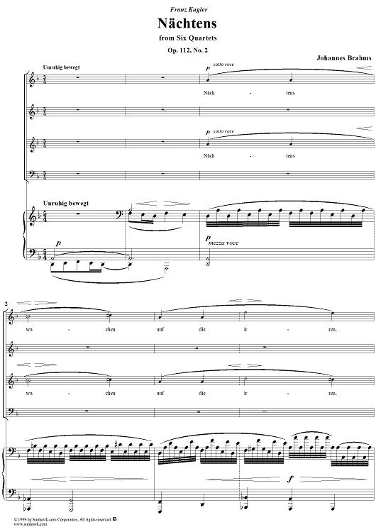 Digital Sheet Music for Six Quartets, op. 112, no. 2, Nächtens by , Johannes Brahms scored for Four-part Mixed Chorus/Piano; id:274209