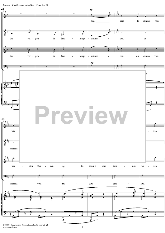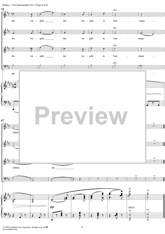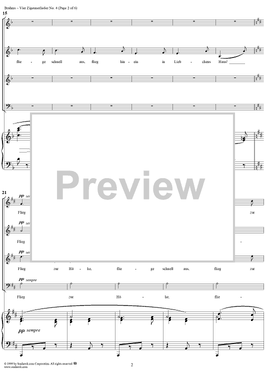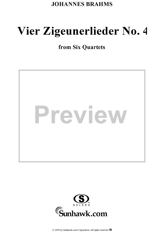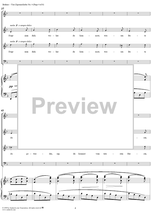 Digital Sheet Music for Six Quartets, op. 112, no. 6, Vier Zigeunerlieder, Nr. 4 by , Johannes Brahms scored for Four-part Mixed Chorus/Piano; id:274216