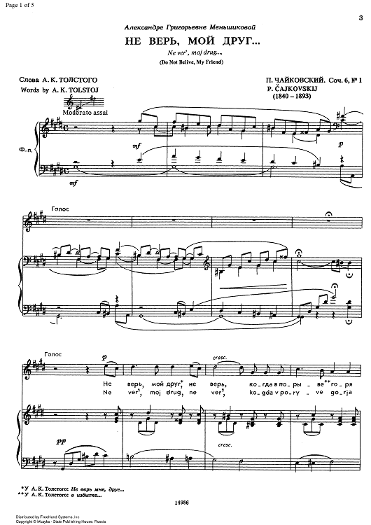 Digital Sheet Music for Six Romances. No. 1. Do Not Believe, My Friend by Peter Ilyich Tchaikovsky scored for Soprano or Tenor/Piano; id:337109