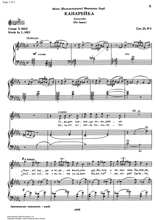 Digital Sheet Music for Six Romances. No. 4. The Canary by Peter Ilyich Tchaikovsky scored for Soprano or Tenor/Piano; id:337111