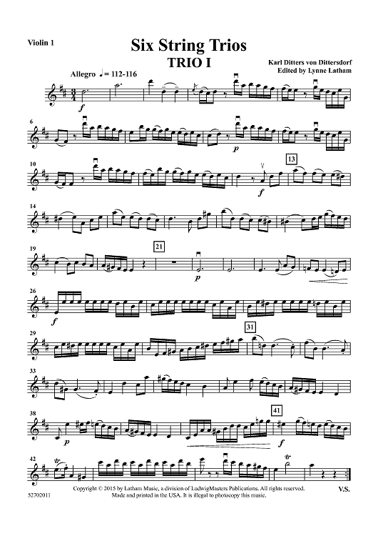 Digital Sheet Music for Six String Trios: Trio I in D Major - Violin 1 by , Karl von Dittersdorf, Lynne Latham scored for String Trio; id:462524