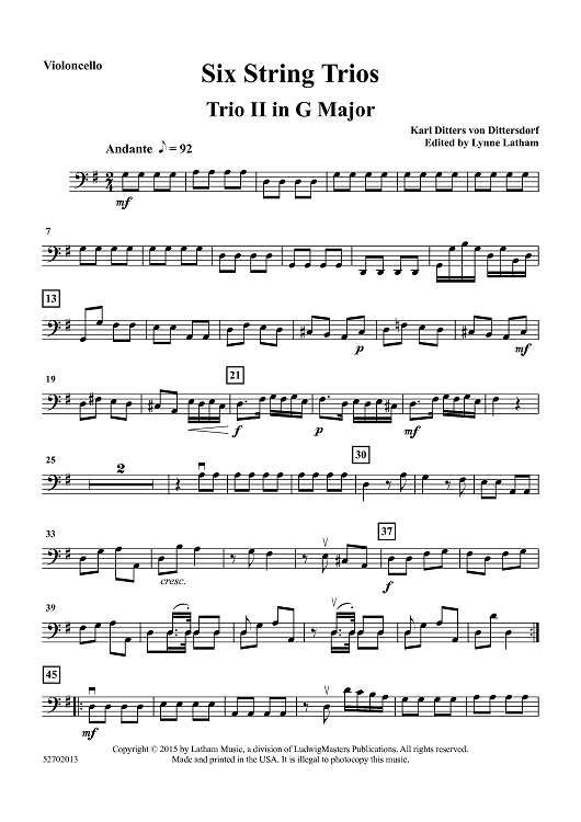Digital Sheet Music for Six String Trios: Trio II in G Major - Violoncello by , Karl von Dittersdorf, Lynne Latham scored for String Trio; id:462533