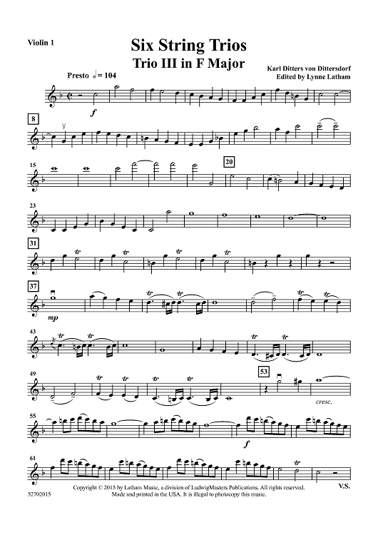 Digital Sheet Music for Six String Trios: Trio III in F Major - Violin 1 by , Karl von Dittersdorf, Lynne Latham scored for String Trio; id:462536