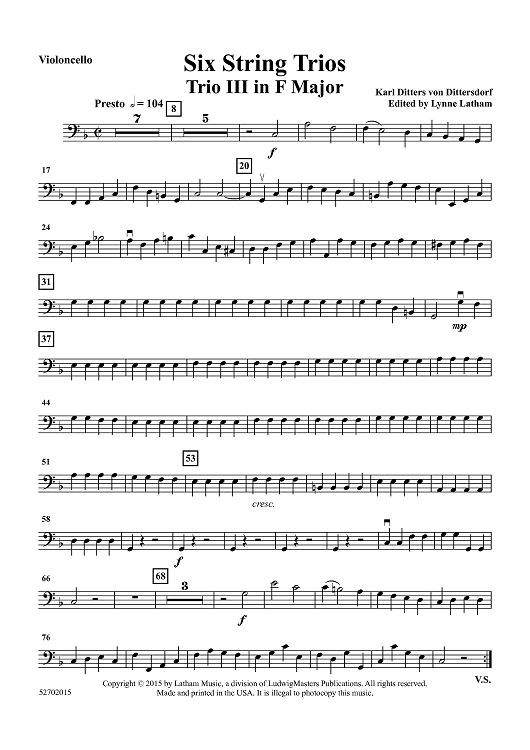 Digital Sheet Music for Six String Trios: Trio III in F Major - Violoncello by , Karl von Dittersdorf, Lynne Latham scored for String Trio; id:462539