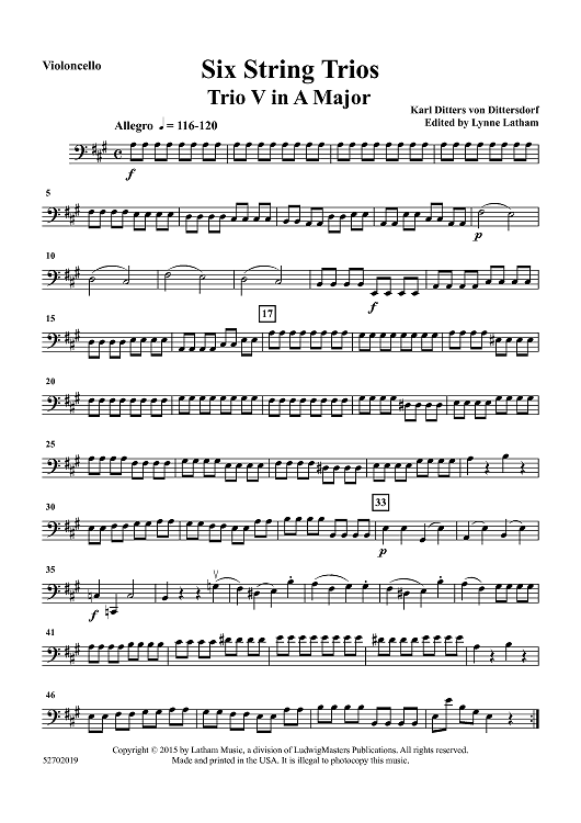 Digital Sheet Music for Six String Trios: Trio V in A Major - Violoncello by , Karl von Dittersdorf, Lynne Latham scored for String Trio; id:462551