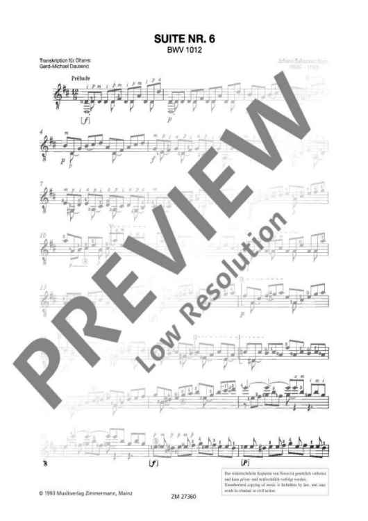 Die 6. Suite gilt in Cellistenkreisen als schwer zu realisieren. Demenstsprechend ist auch der Schwierigkeitsgrad der Gitarrenadaption als hoch anzusetzen. Im vorliegenden Fall wurde die Originaltonart beibehalten.