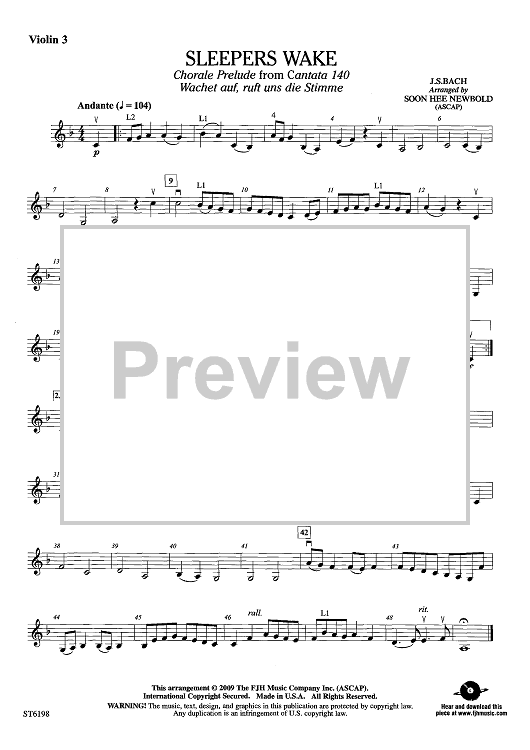 Digital Sheet Music for Sleepers Wake - Choral Prelude from Cantata 140 - Violin 3 (Viola T.C.) by Johann Sebastian Bach, Soon Hee Newbold scored for String Orchestra; id:441697