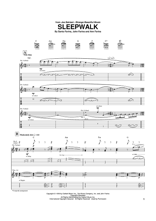 Digital Sheet Music for Sleepwalk by Jeff Beck, Ann Farina, John Farina, Santo Farina, Santo & Johnny, Joe Satriani scored for Guitar Tab; id:371538
