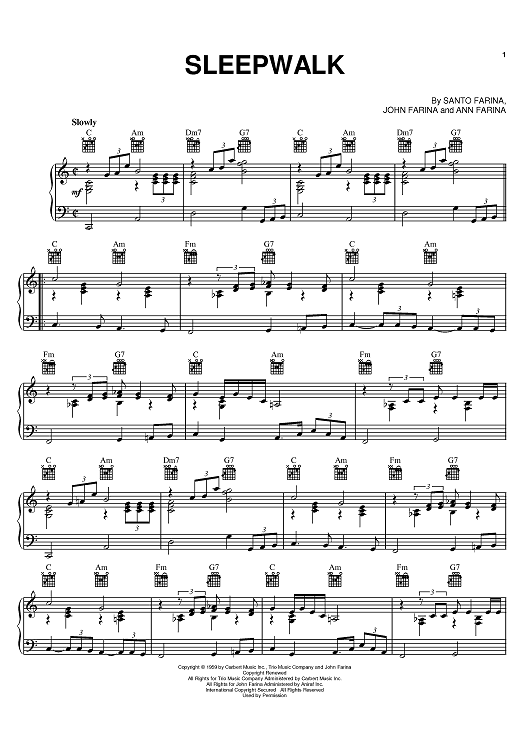 Digital Sheet Music for Sleepwalk by Ann Farina, John Farina, Santo Farina, Santo & Johnny scored for Piano/Vocal/Chords; id:381076