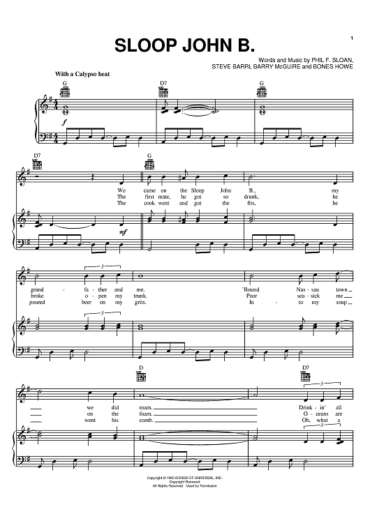 Digital Sheet Music for Sloop John B. by Steve Barri, Barry McGuire, Bones Howe, P. F. Sloan scored for Piano/Vocal/Chords; id:383807