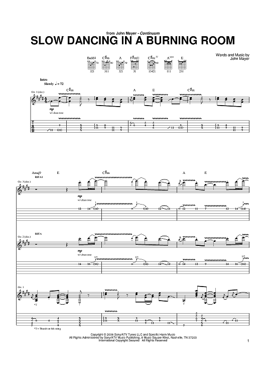 Digital Sheet Music for Slow Dancing In A Burning Room by John Mayer scored for Guitar Tab; id:396589