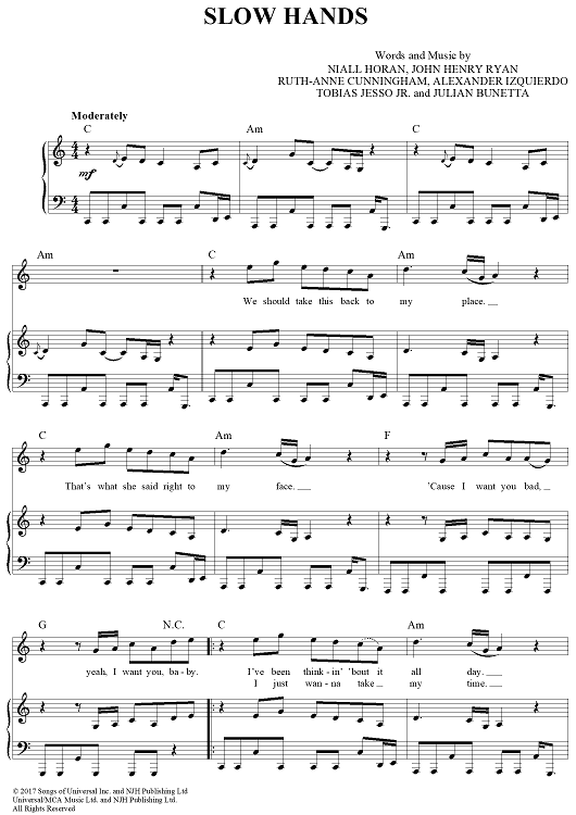 Digital Sheet Music for Slow Hands by Ruth-Anne Cunningham, Niall Horan, Julian Bunetta, Tobias Jesso, Alexander Izquierdo, John Henry Ryan scored for Piano/Vocal/Chords; id:464693