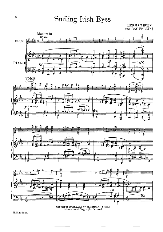 Digital Sheet Music for Smiling Irish Eyes by , Ray Perkins, Herman Ruby, Anthony Colicchio scored for Banjo/Piano; id:418703