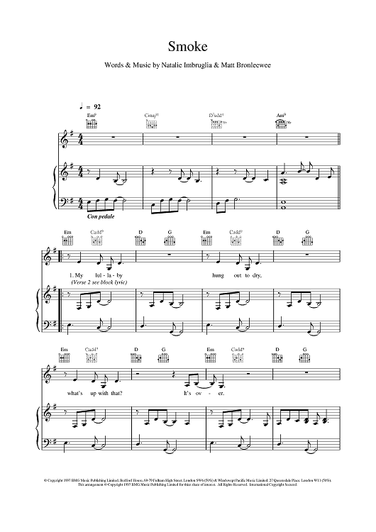 Digital Sheet Music for Smoke by Natalie Imbruglia, Matt Bronleewe scored for Piano/Vocal/Chords; id:376578